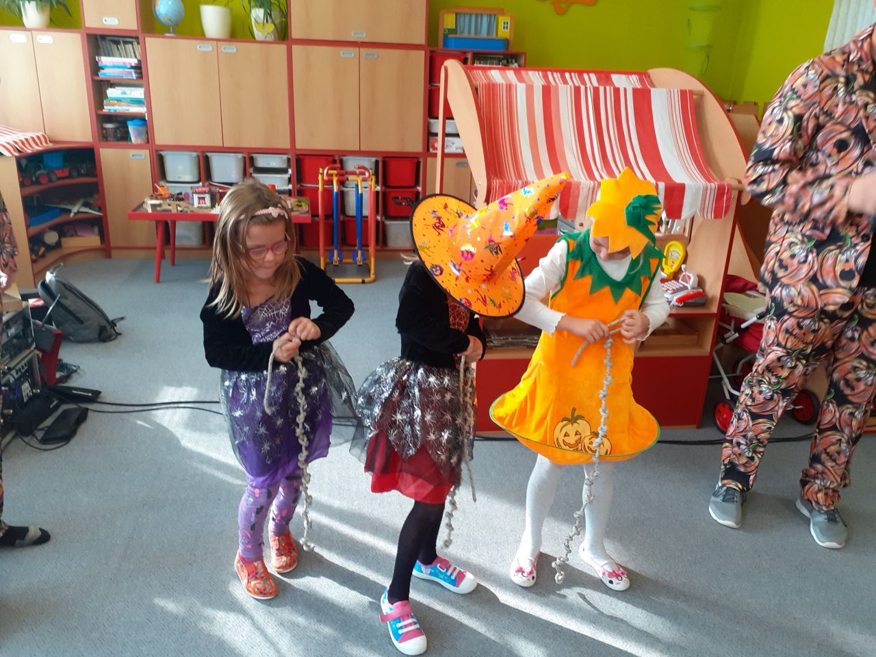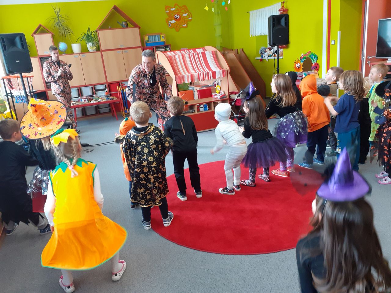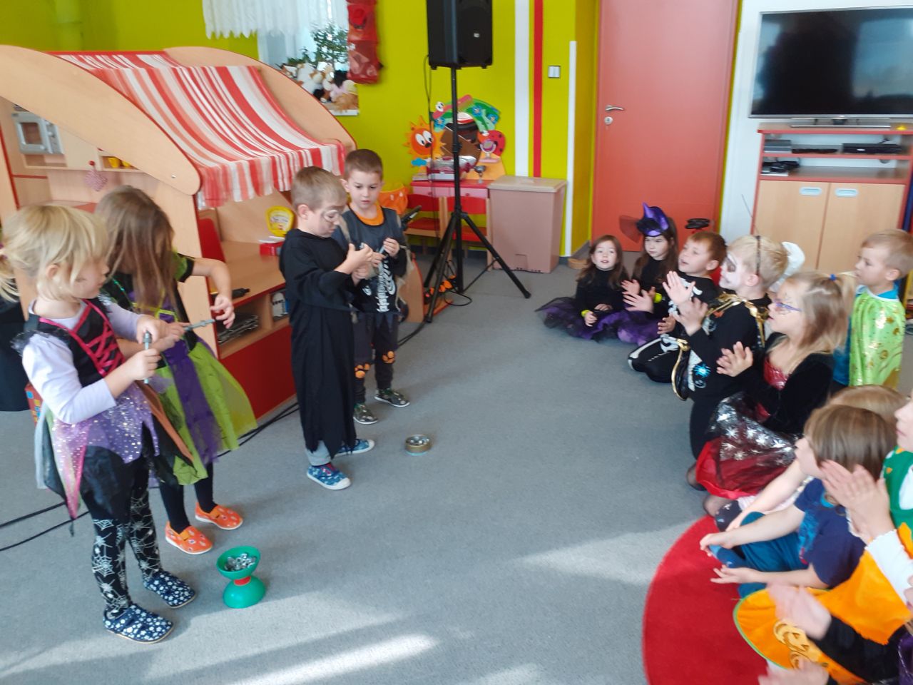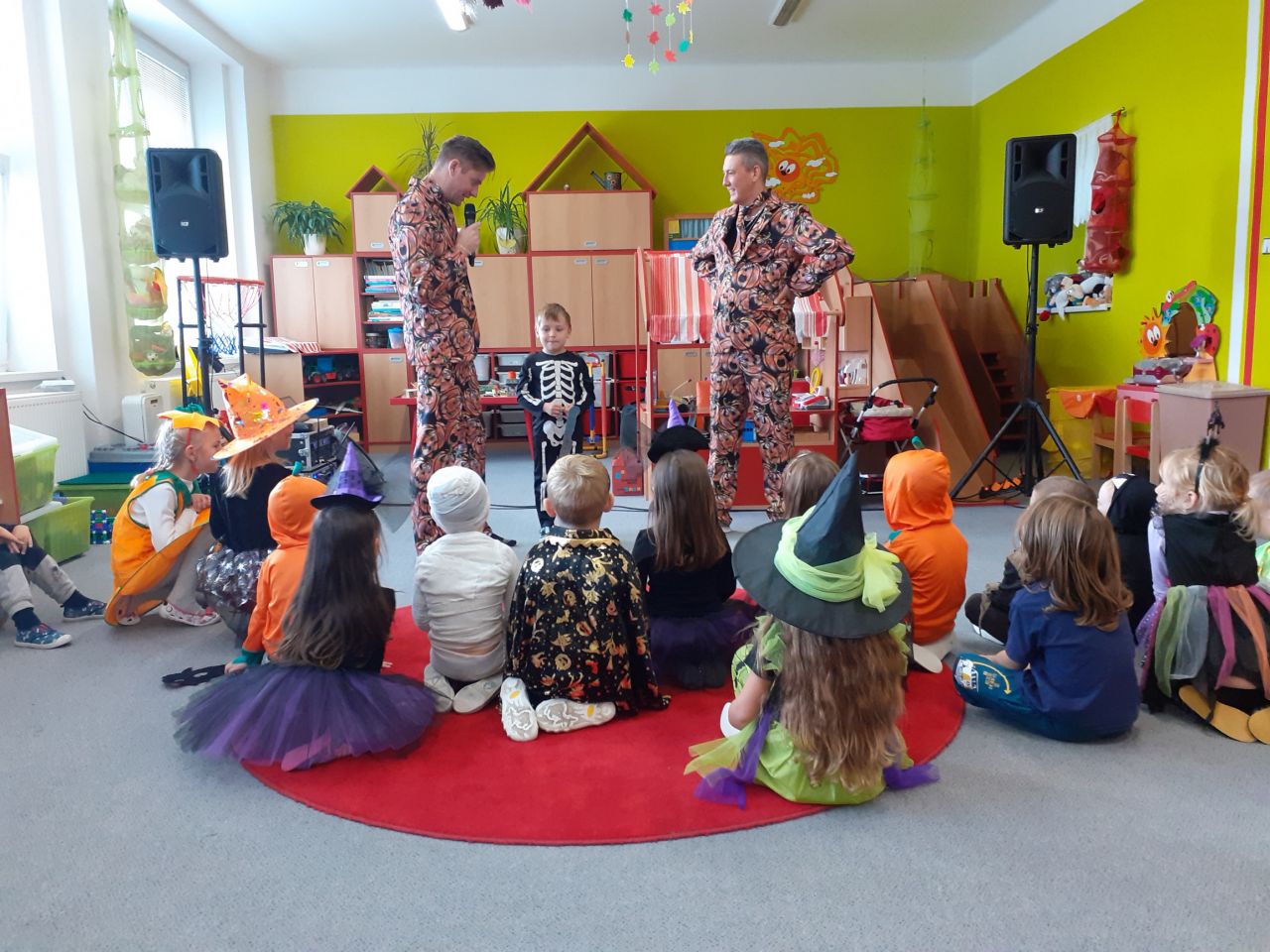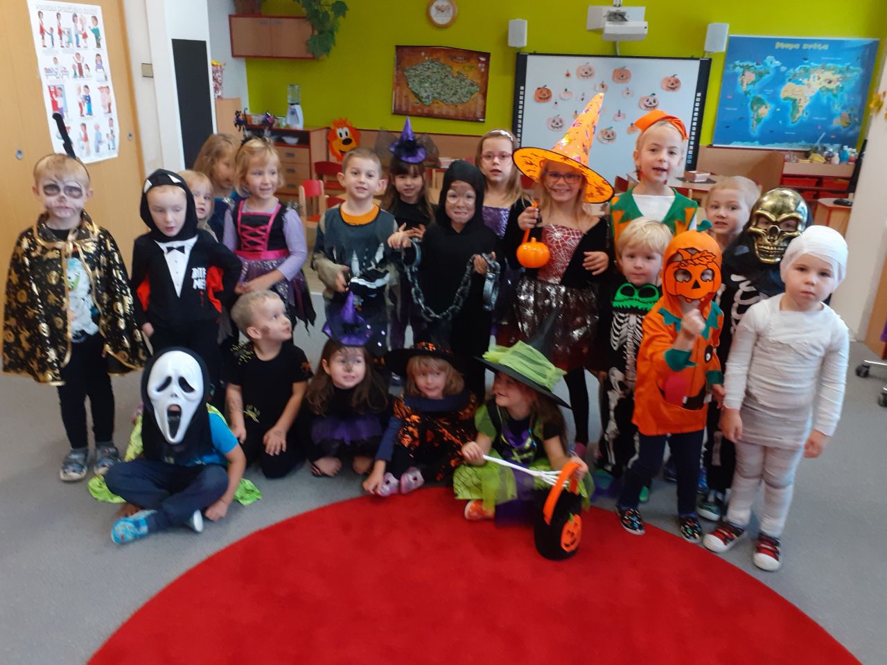 Dopolední strašidelný rej v maskách se moc vydařil. Děti se krásně vyřádily se strašidláckými kamarády, zasoutěžily a zazpívaly veselé písničky. Dokonce si zatančily i paní učitelky.