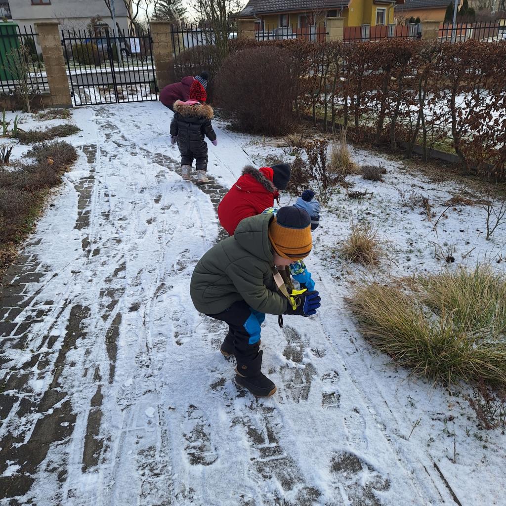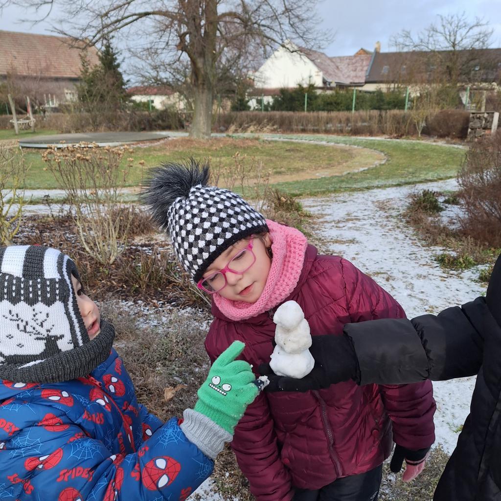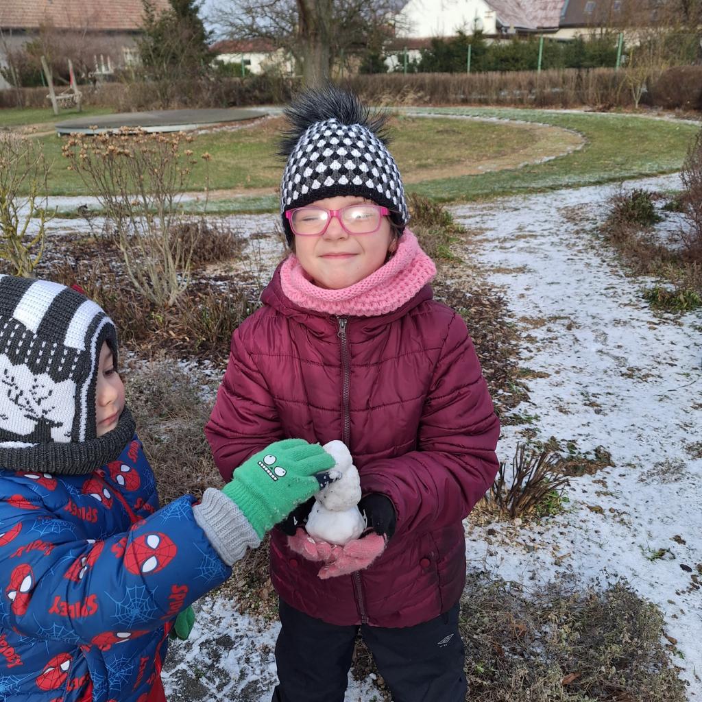 Sněhu nebylo mnoho, ale přesto jsme si poradili, sněhuláčky postavili :-)